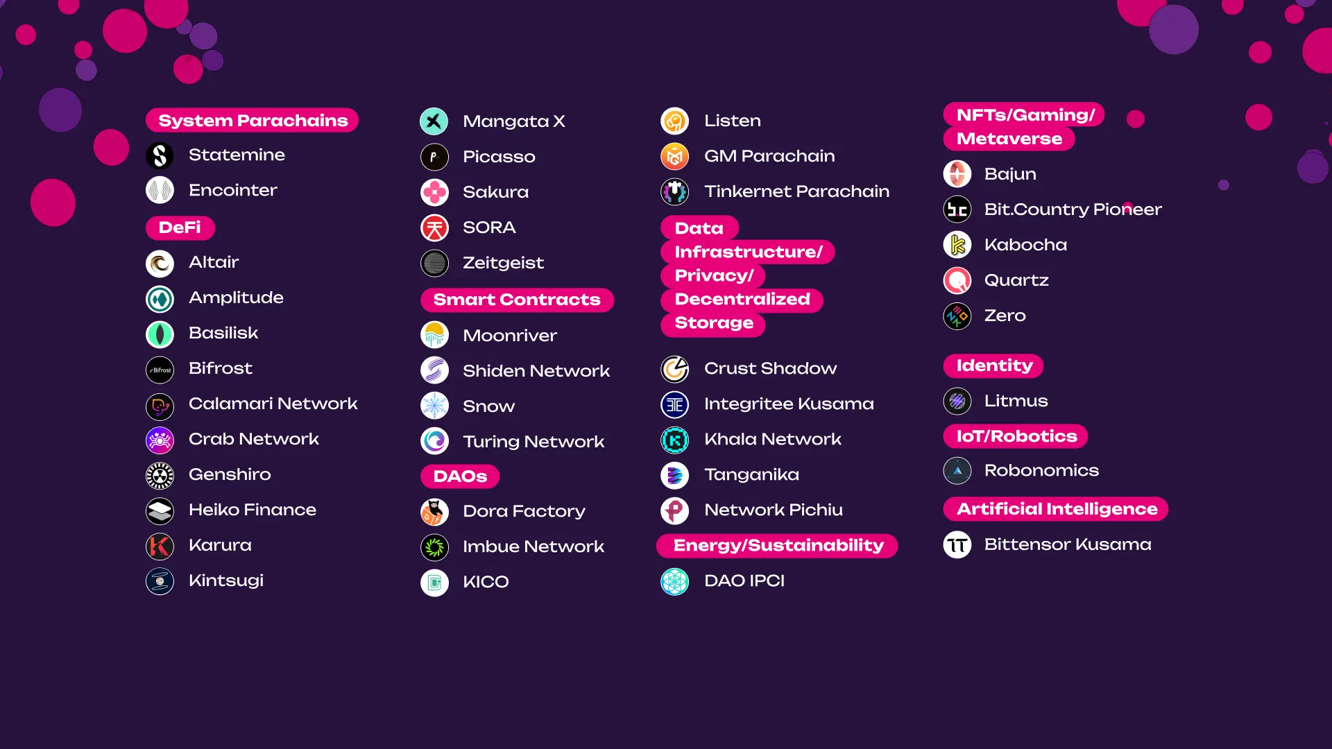Beyond the parachains currently on Polkadot, an additional 42 have joined Kusama, Polkadot’s canary network. Kusama is where brilliant builders come to innovate, providing a live, value-bearing environment for teams to battle-test their technologies and mitigate risk, build a community, and develop partnerships before a production deployment to Polkadot, or to build and iterate more experimental use cases.
