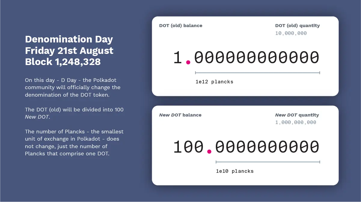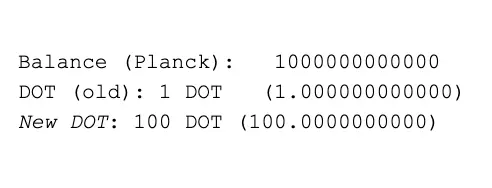 On August 21st at approximately 13:15 UTC (block number 1,248,328), the DOT token will undergo a redenomination from its original sale. ‘New DOT’ will be 100x smaller than ‘DOT (old)’.