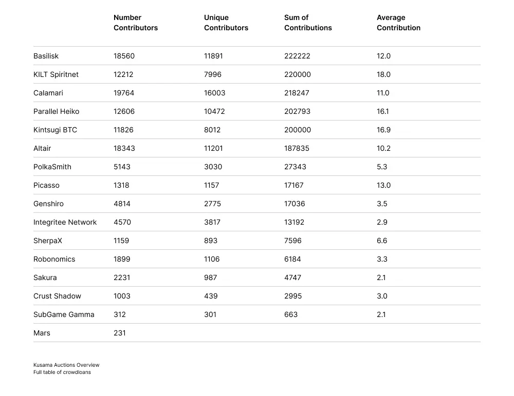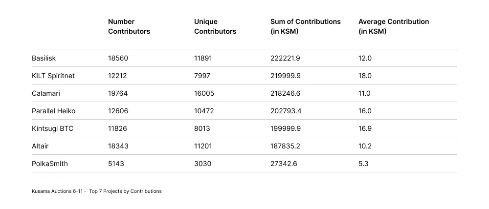 The following table summarizes relevant metrics for the seven projects with the highest locked KSM for crowdloans, ordered by the amount of contributions (the full table is available in the Appendix).
