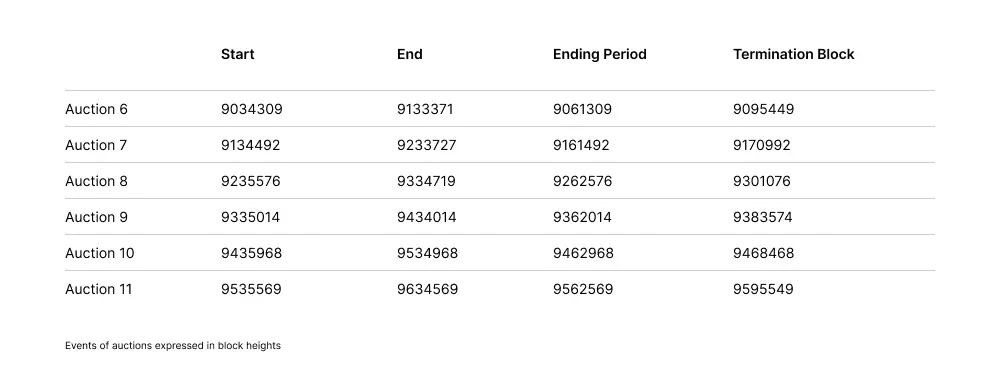 When Kusama’s governance body enabled the second batch of auctions, the plan was to allocate another set of five parachain slots. Later and after some discussion within the community, the council, as representatives of the token holders, scheduled a sixth auction. This brings the total number of parachains (at the time of writing) to twelve — eleven allocated by auctions and one, Statemine, allocated by governance as a common good parachain. This was possible because experts agreed on the technical stability of the network and because there was enough time to fit in an auction before the start of the subsequent lease period. In total, the second batch of 6 auctions ran from September 1st until October 13th. Each auction lasted seven days with a two-day starting period and a five-day ending period (candle phase). The table below provides the dates for the four important events of each auction (the same table with the events expressed in their block heights can be found in the Appendix).