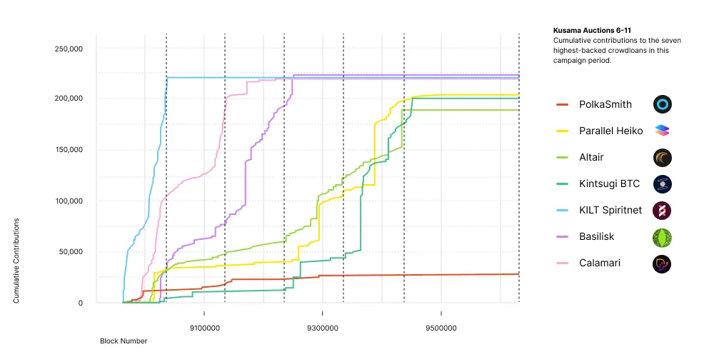 The second batch of auctions on Kusama has concluded and all parachains have been successfully onboarded. The winners of this batch of auctions, in order, were KILT Spiritnet, Calamari Network, Basilisk, Altair, Parallel Heiko, and Kintsugi BTC. In this batch of auctions, there are three things to highlight: