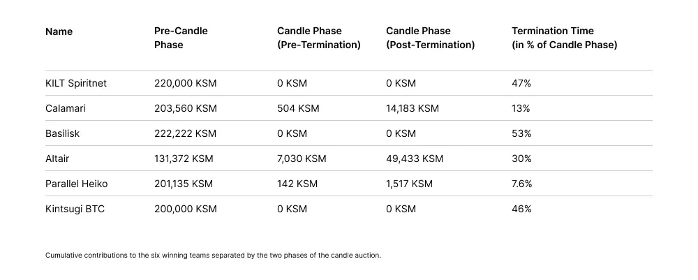 First, we saw, for the first time ever in any Kusama auction, that the candle mechanism picked a winner that was not in the lead at the end of the auction. This further emphasizes the importance of contributing as early as possible during the ending period, both for users as well as teams that might help their own crowdloan.
