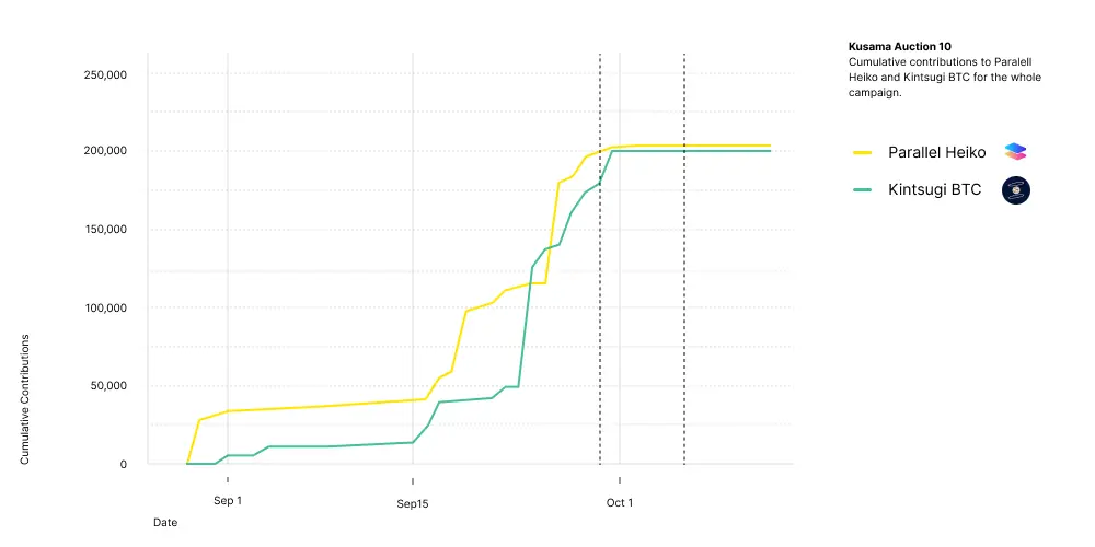 Because Parallel Heiko set a funding cap of 400,000 KSM and Kintsugi BTC of 200,000 KSM, the former was able to outcompete the latter. Parallel Heiko had the winning bid in 100% of the samples, and thus, it was clear that they would win the slot. Kintsugi BTC reached their cap during the auction and therefore was not able to gather more contributions, which sealed the outcome. One could argue that, for the first time in Kusama auctions, the outcome was determined by the contribution cap set by a team. Interestingly, the contribution curve for Parallel Heiko flattens out after beating the 200,000 KSM cap of Kintsugi BTC, indicating that users strategically bonded tokens with the aim of winning the slot. Ultimately, Parallel Heiko won auction 10 with a bid of 202,793.4 KSM.