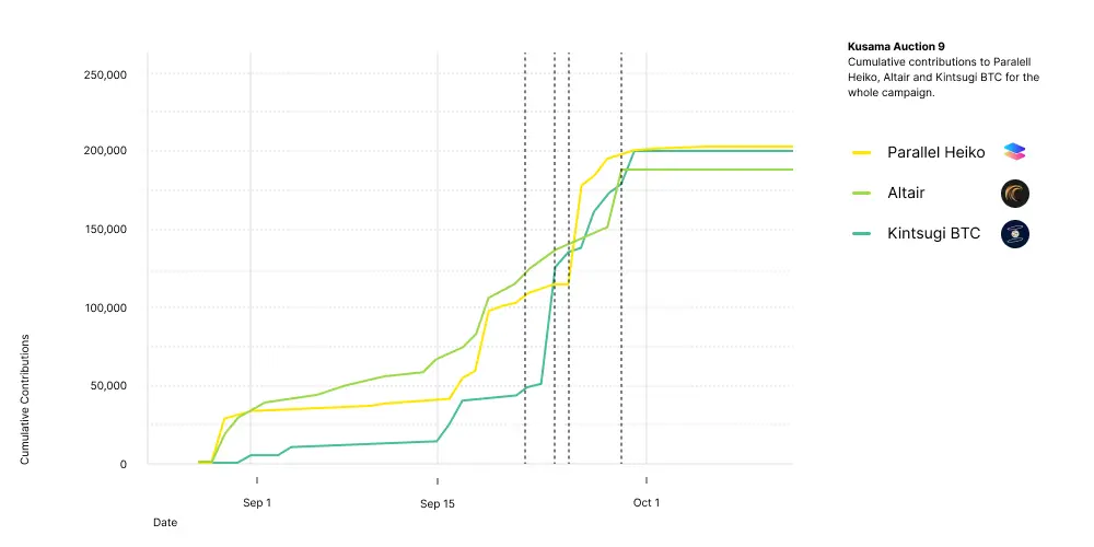 In auction 9, there were three teams that realistically had a chance to compete for the slot. Those were Altair, Parallel Heiko, and Kintsugi BTC. Altair was able sustain a lead for quite a while early on in the auction, but Parallel Heiko’s crowdloan surpassed the number of tokens locked by Altair during the ending period and consequently took over the winning bid. While Kintsugi BTC’s crowdloan managed to secure a significant number of locked tokens in a short time, propelling them past Altair, in the end they were beaten by Parallel Heiko. The graph below illustrates the bidding over time. The vertical lines indicate the beginning of the auction, the start of the ending period, the retrospective ending block, and the end of the bidding phase.