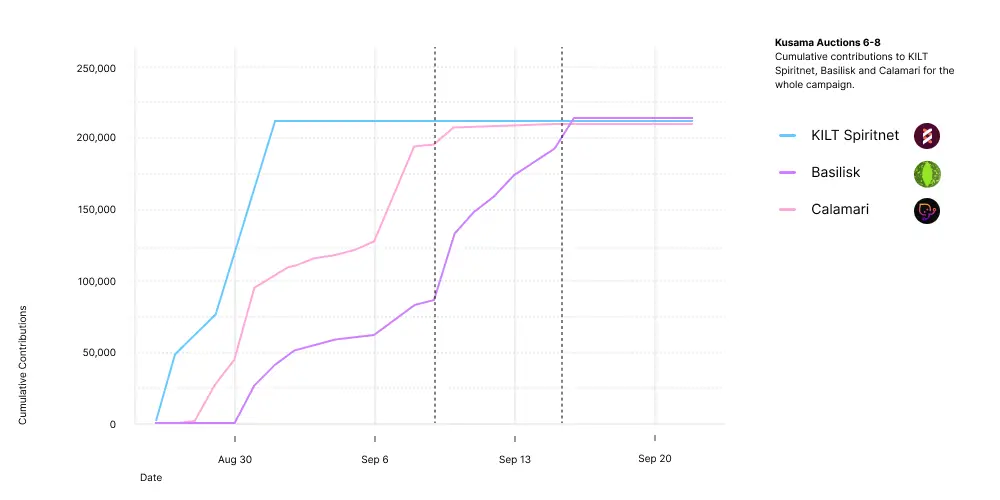 Similarly to the first batch of auctions, we observed three teams taking the lead early on. Those three managed to win auction 6-8 without much interference from each other. That is, at no point during the auctions did the winning bid flip between teams. KILT Spiritnet, the winner of the first auction of this batch (auction 6), reached their cap of 220,000 KSM shortly after the beginning and well before the ending period started. While the contribution levels of the two other teams came close to each other, at no point did the winning bid change during the respective auctions. Auction 7 was won by Calamari Network with a total of 218,247 locked KSM, and auction 8 was won by Basilisk after hitting their cap with a total of 222,222 KSM.
