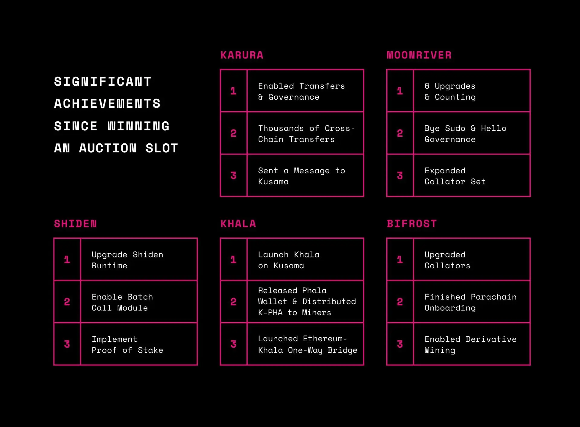 The 5 winning projects, in order, were Karura, Moonriver, Shiden, Khala, andBifrostand each, in turn, are working through their relative launch phases. By gradually expanding their feature-set, Kusama’s first parachains are already taking advantage of the built-in and forkless upgradability provided by Substrate and have brought more value to the ecosystem.