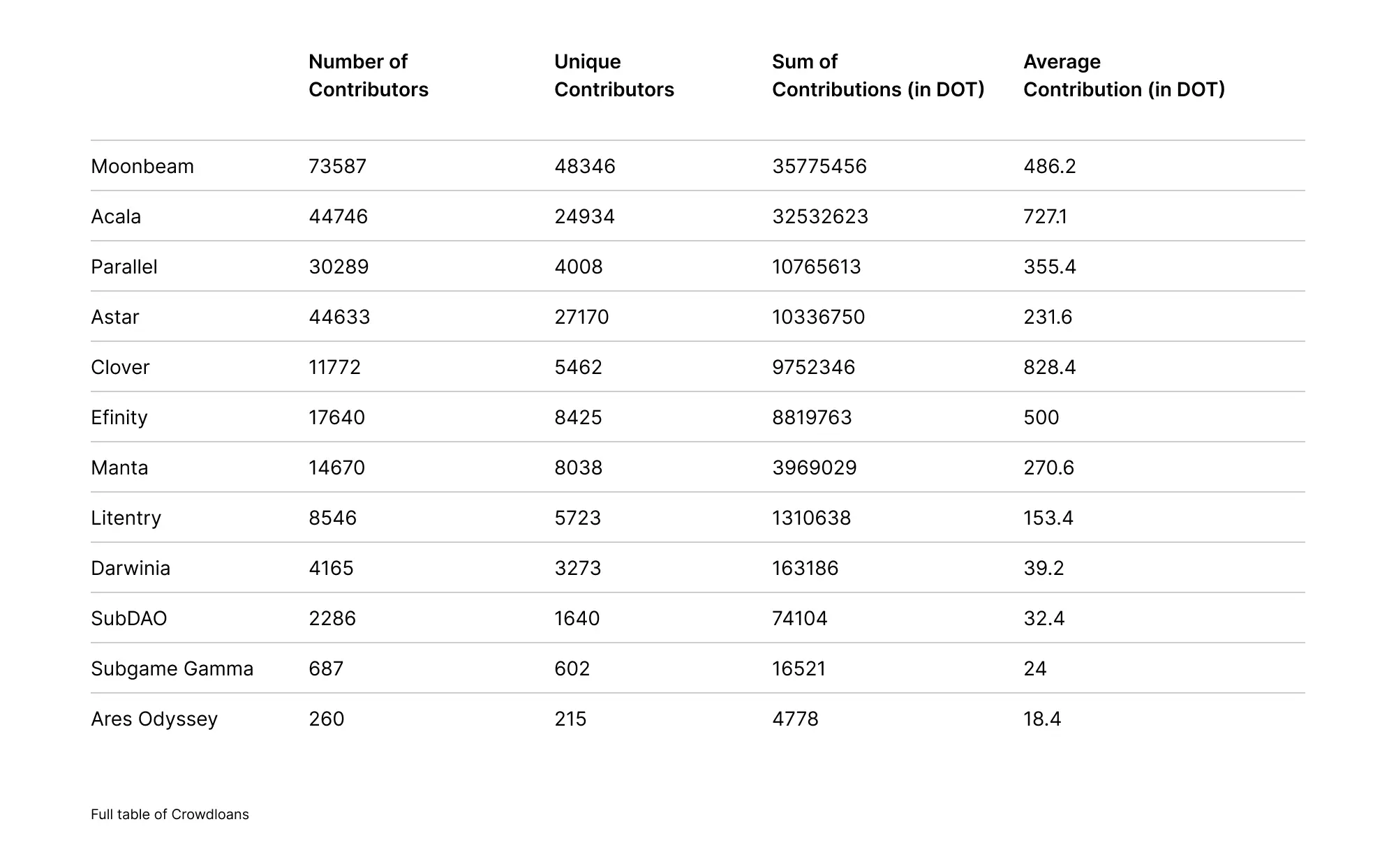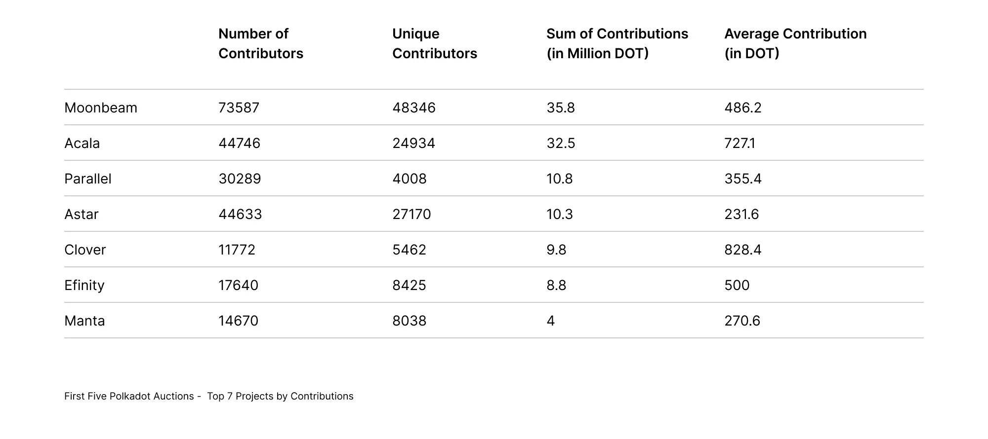 The following table summarizes relevant metrics for the seven projects with the highest locked DOT for crowdloans ordered by the amount of contributions (the full table is available in the Appendix).