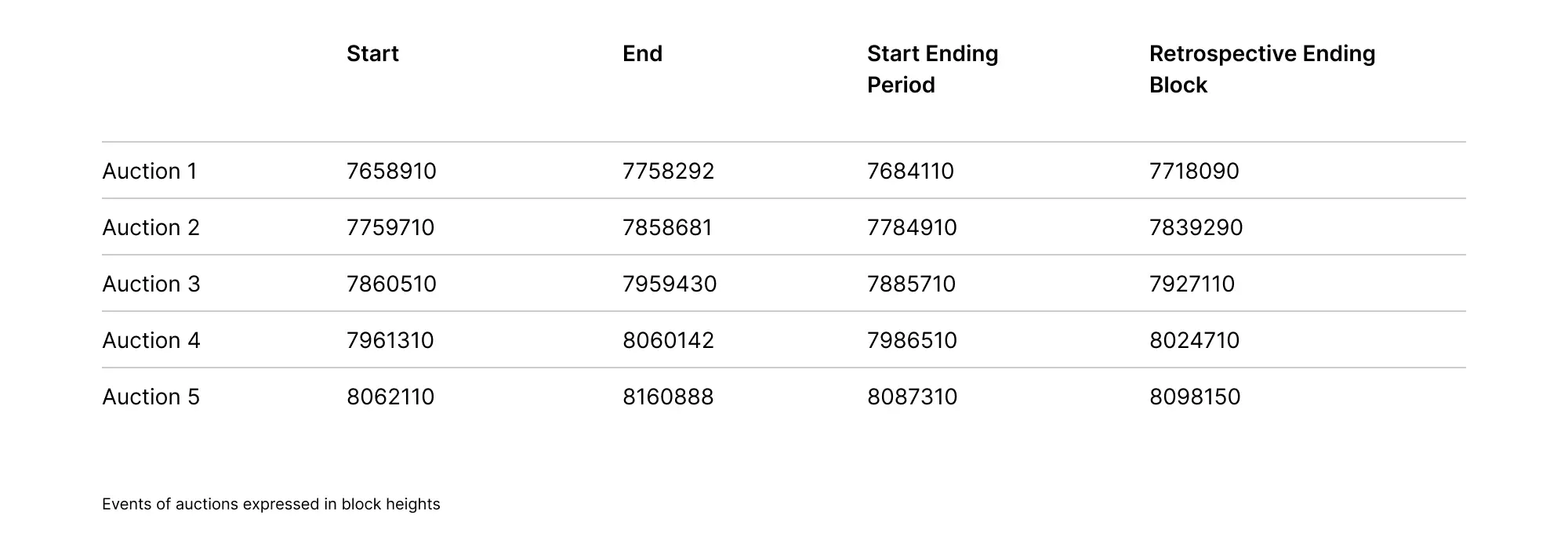 The start and end blocks of the auction determine the fixed length of each auction and give participants certainty about the overall framework. The first phase of the auction, lasting exactly 25,200 blocks (around 42 hours), serves as a grace period where teams and users have time to get an overview of the situation, gather information, and set up their bidding/contributing strategies. Although bidding is enabled, the blocks in this phase are not yet considered by the mechanism, i.e., the retrospective ending block cannot fall inside that range.