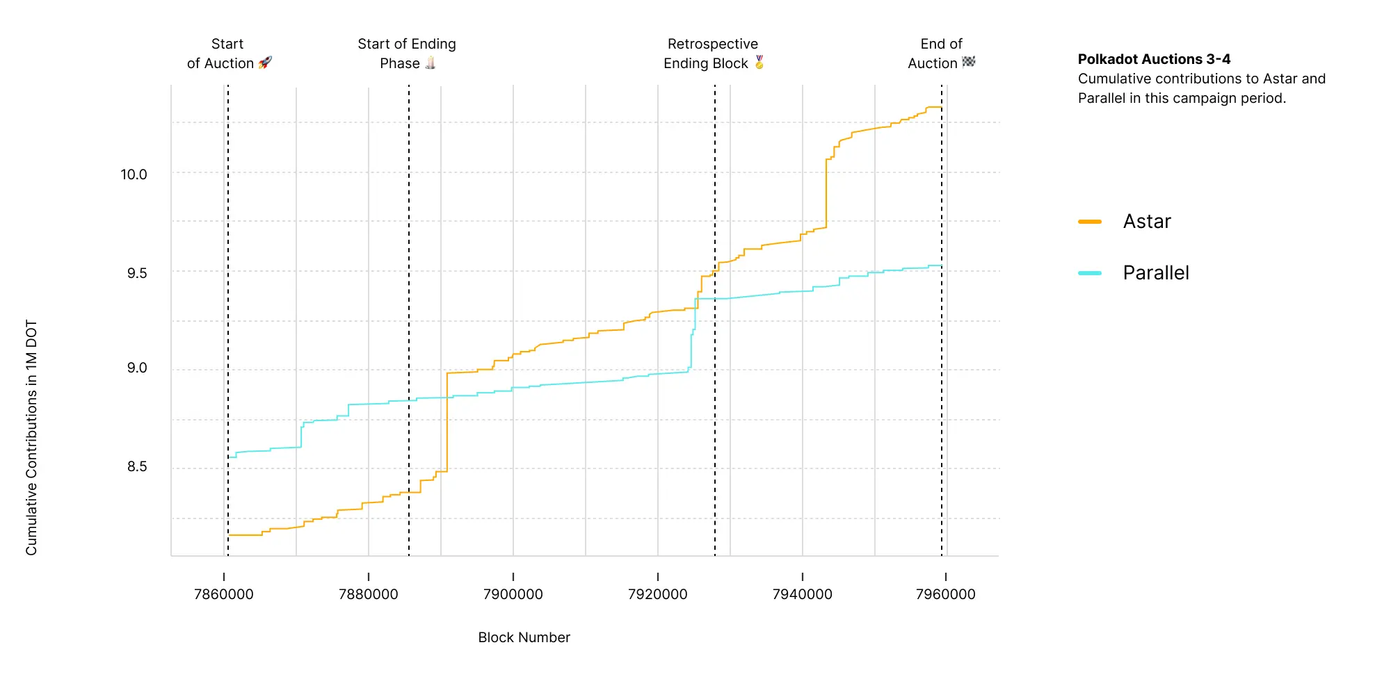 In the end, Astar was able to lead in 92.64% of the blocks in the ending period and thus, with no surprise, won the third auction on Polkadot. In total, 10.3 Million DOT were locked. With no other project coming close, Parallel won the fourth auction without any competition seven days later, with a total contribution of 10.8 Million DOT. Note that once again, the amount locked exceeded the winning bid from the previous auction.