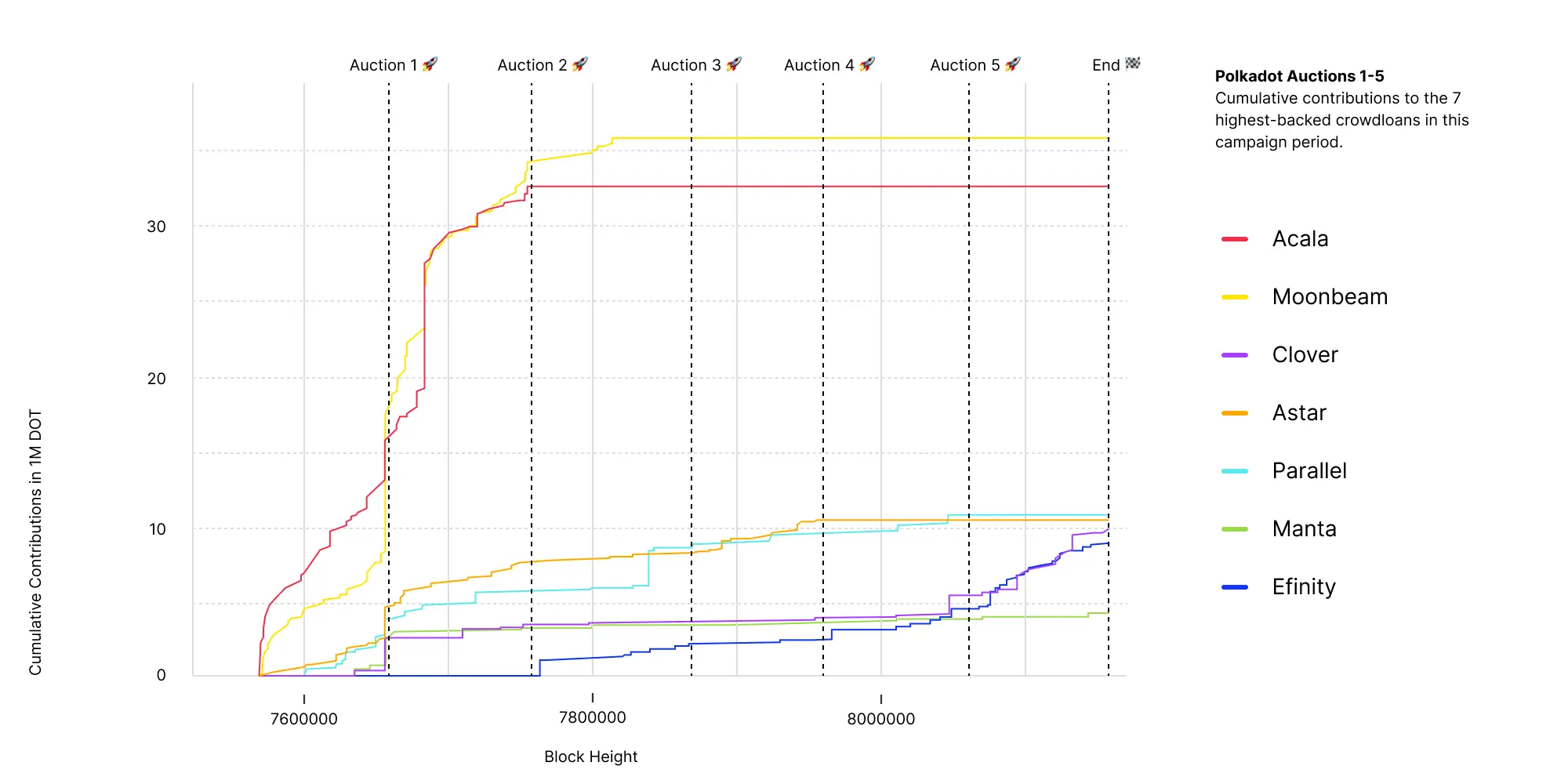 The following graph shows the cumulative contributions of the seven highest-backed crowdloans for the whole campaign. This gives some visual insights about the contribution dynamic to the different projects.