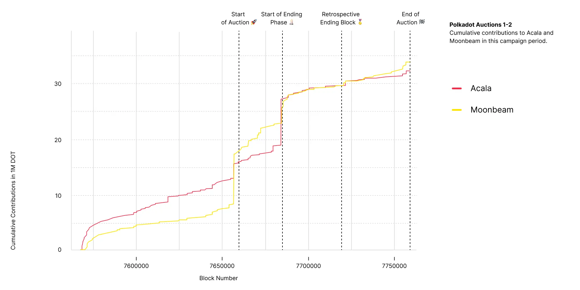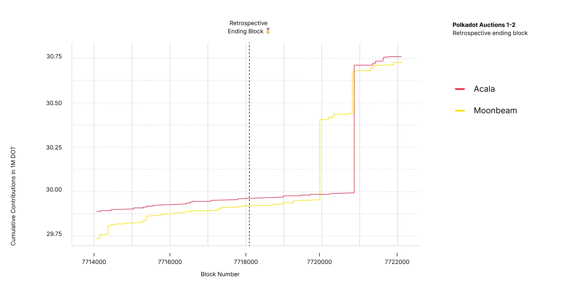 In the close-up view above, we can clearly see that the winning bid was held by Acala at the retrospective ending block. If a block only around 2,000 blocks (or ~3.5h) later had been selected, Moonbeam would have been the lucky winner: That is the candle mechanism in action. For more information on how this block is selected, see the section “Who blows out the candle?” here.