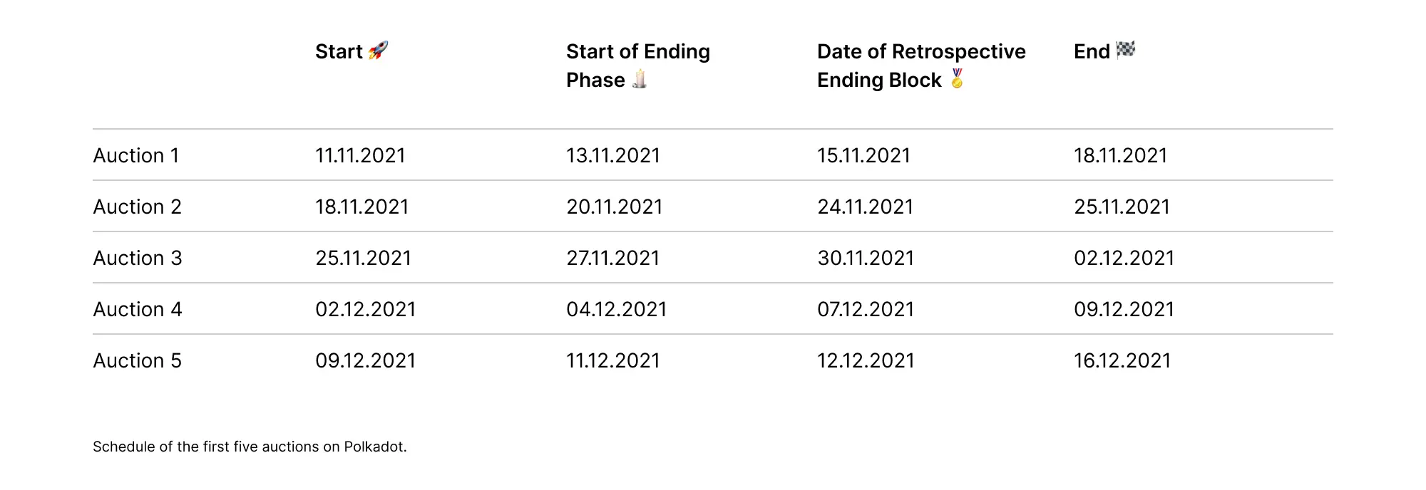 The first batch of Polkadot auctions was enabled by the governance body of the network and was set for the first five available slots. In total, the first batch ran from November 11th until December 16th, 2021. Each auction lasted seven days with a two-day starting and five-day ending period. Although the first five Kusama parachains onboarded immediately after winning a slot, in Polkadot all winners of the first batch began onboarding simultaneously on December 17th. The following table provides the dates for the four important events surrounding each auction (the same table with the events expressed in their block heights can be found in the Appendix).