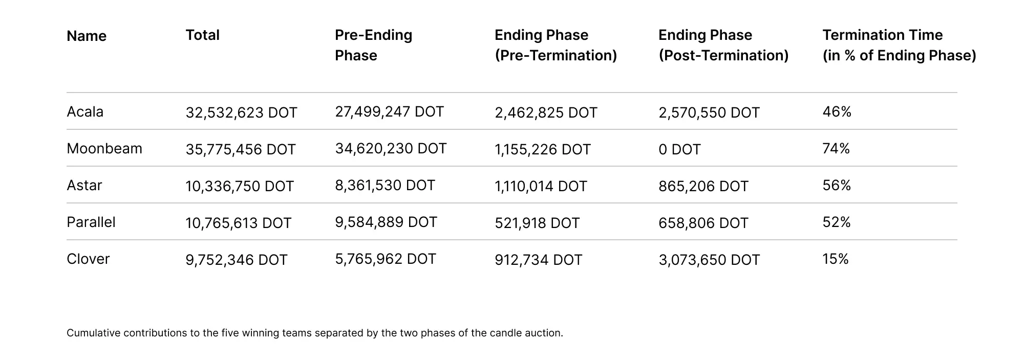 The candle auction is composed of two different stages, namely the starting and ending phase. The latter is further divided (retrospectively), into a period that falls before and after the termination block. This mechanism could lead to the situation where the highest bidder at the end of the auction does not necessarily win the auction, because their winning bid is discarded if it falls into the range after the retrospective ending block. In contrast to auctions on Kusama, that has not happened here. All tokens contributed to a winning crowdloan, including those contributed after the ending block, are locked for the entirety of the respective leasing period. This means that we could observe some inefficiency, both in determining the winner and in locking tokens that did not contribute to a higher winning bid. In the next table, the sum of contributions is separated by the respective phases. Additionally, the table shows when the retrospective ending block occurred as a percent of the whole ending phase.