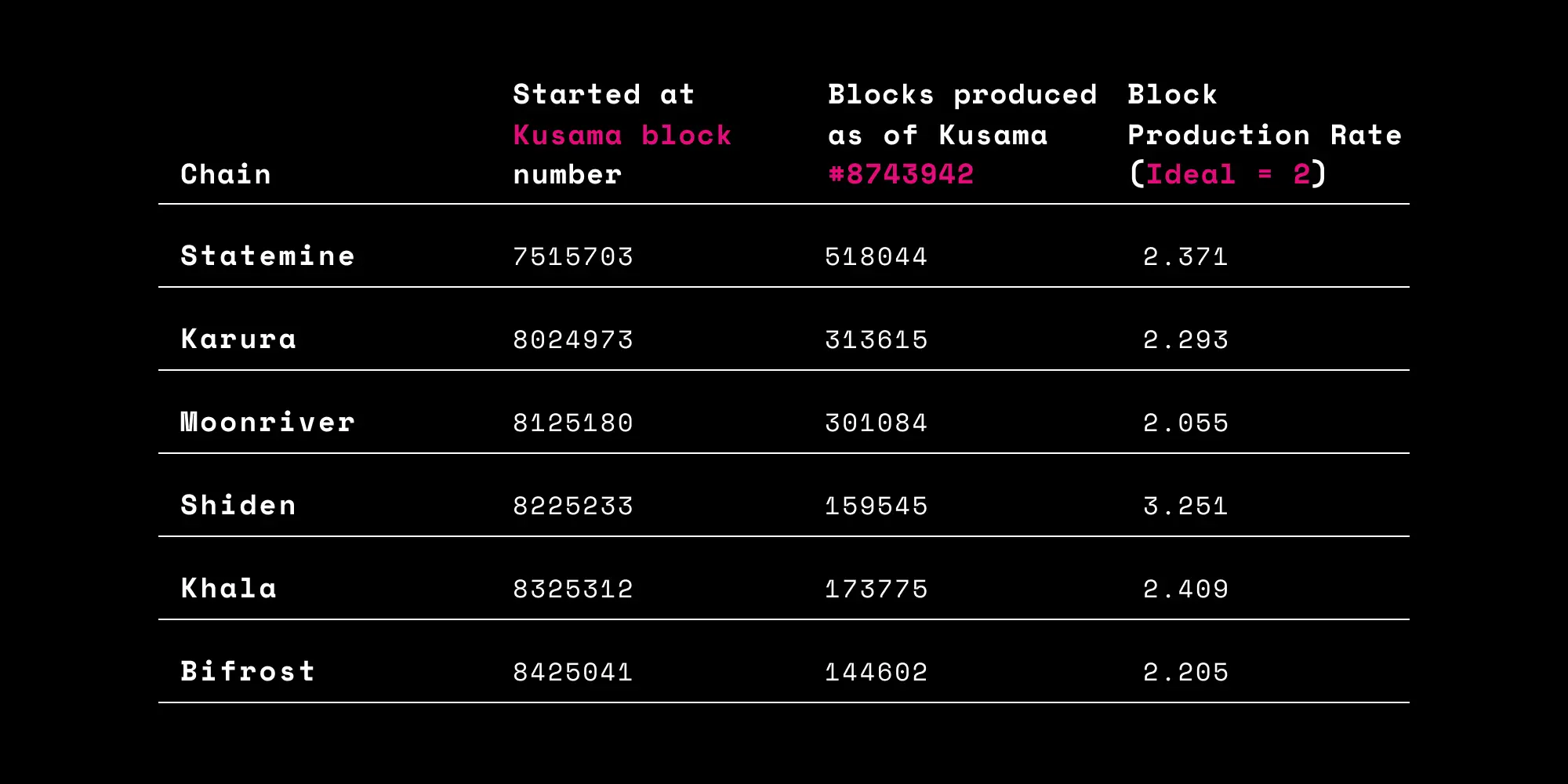 The effect of network noise is not worth considering at this time, as over these past days the parachains have not had enough time to be repeatedly exposed to every possible combination of backing validators. But noise certainly does not explain the large discrepancy between Shiden (and to a lesser extent, Khala) and the rest of the parachains, which mostly occupy the band between 5 and 10% off the ideal. It is worth noting that Statemine had a rocky period in the first few weeks of its launch which caused it to produce blocks only once every minute, and the current data is skewed by that initial issue.