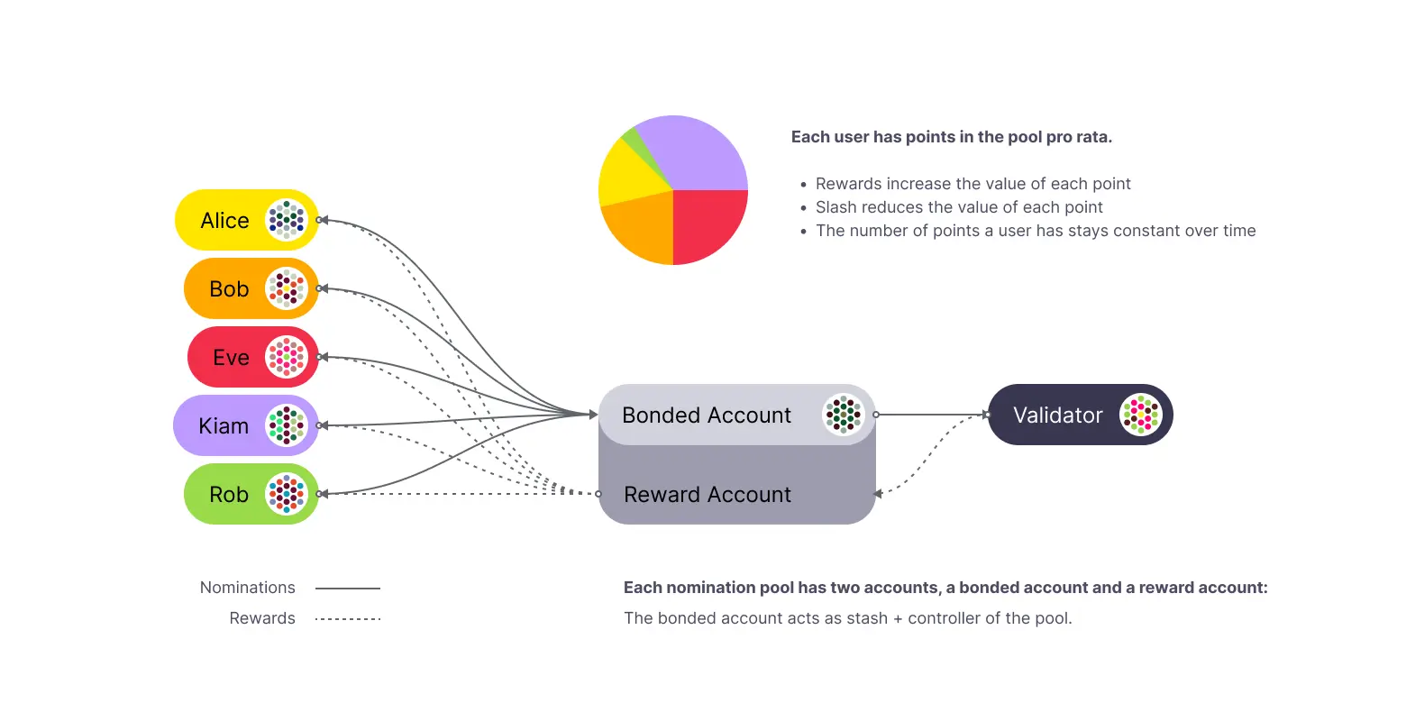 With nomination pools, the creator of a pool manages nominations on behalf of pool members, reducing the time and overhead necessary to participate in nomination. Of course, pool members should still conduct their own due diligence when determining which pool to join. In contrast to direct nomination, pools also do not require users to create both a stash and controller account, further reducing the complexity of native staking.