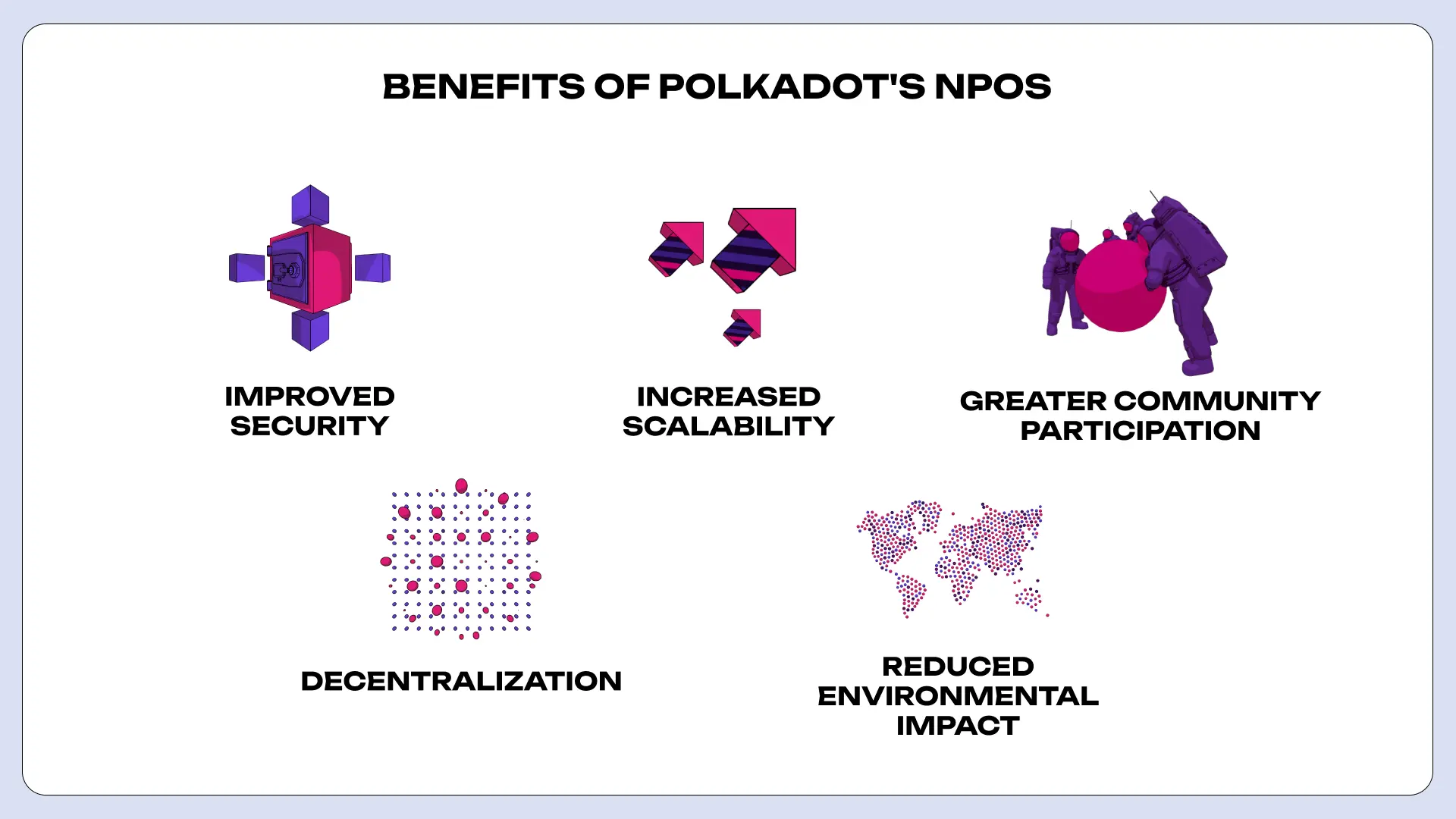 By adopting NPoS, Polkadot gained several key advantages. Along with improving security, NPoS encourages greater community involvement, thereby increasing the network's resilience. Token holders from diverse backgrounds can actively contribute to strengthening the economic security of the network (with few limitations) and get rewarded for participating in governance and validation (staking). Not only does this level the playing field for blockchain participants, it also promotes decentralization of power within the blockspace ecosystem. By allowing token holders to nominate validators, NPoS can also enhance the transaction processing capacity of a network and facilitate smoother operations.