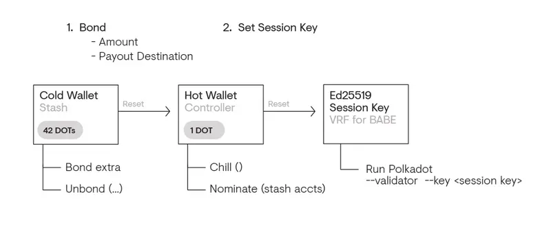 Validators that choose to join the Polkadot network need ways to securely run their validator nodes without worrying about risking their staked DOTs in a hot wallet. In this fourth proof of concept, Polkadot introduces the “Stash” and “Controller” keys for secure staking of DOTs.