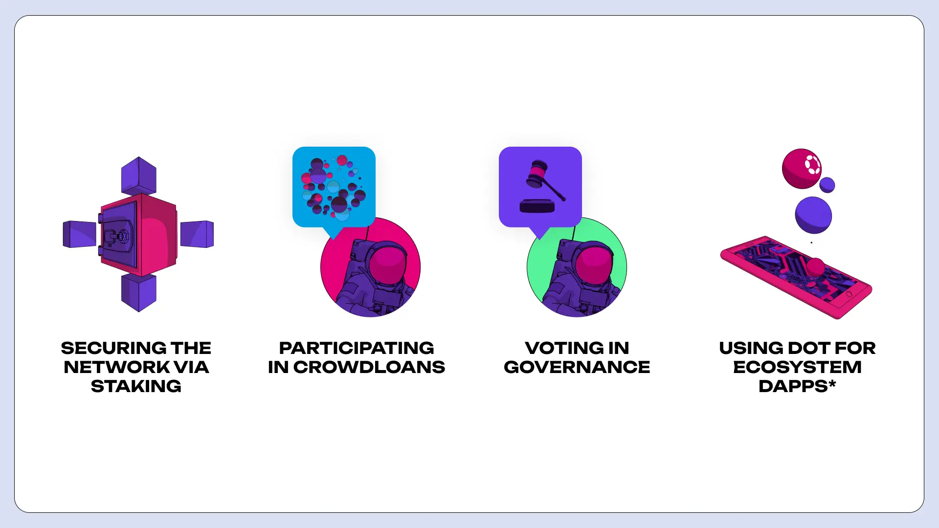 With this in mind, and as crowdloan contributors consider what to do with their newly unlocked DOT, let’s take a look at token utility and the different ways DOT can be used in the Polkadot ecosystem. From helping secure Polkadot’s Nominated-Proof-of-Stake (NPoS) system to participating in governance, dapps, and crowdloans, Polkadot’s native token has a number of uses that support the network and offer benefits in return.