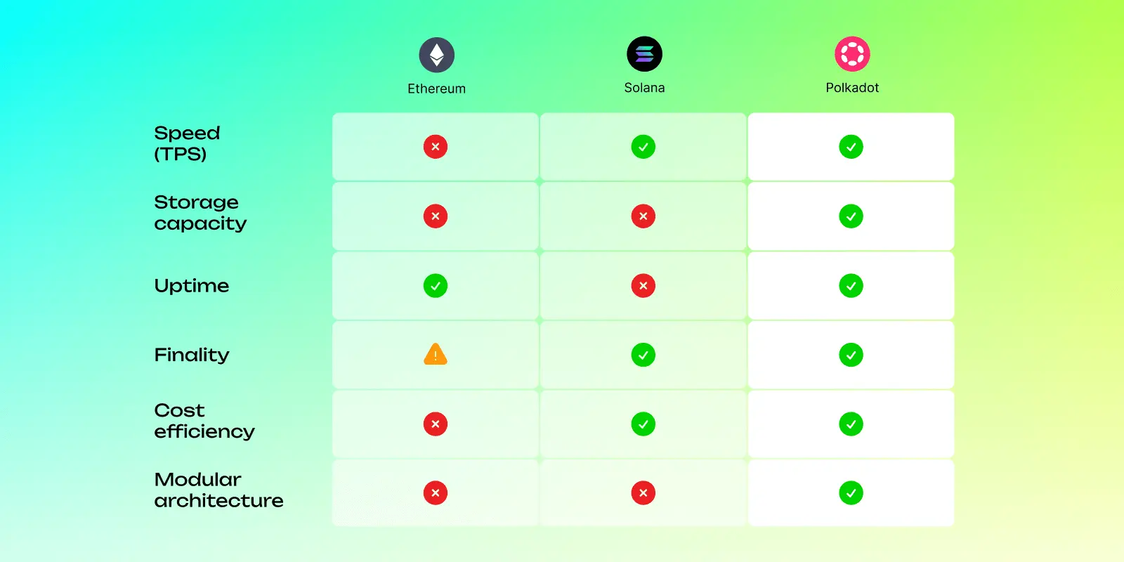 Polkadot's modular approach introduces coordination complexity across multiple chains, but solves this through native cross-chain messaging (XCM) that's built into the protocol layer rather than requiring third-party bridges. This enables Polkadot to handle all five functions without the typical tradeoffs between speed, scalability, and security.