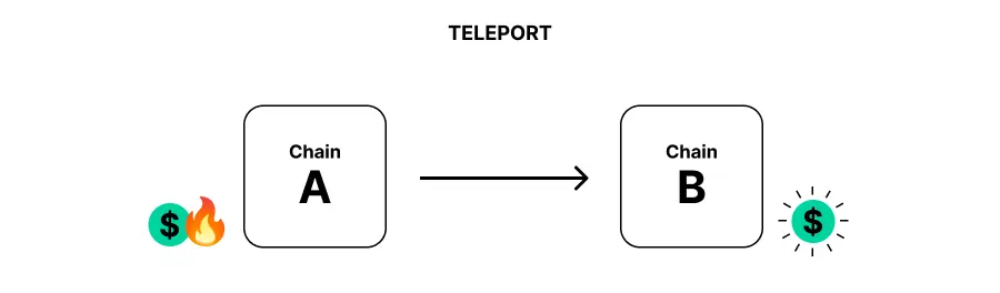 We might have two consensus systems, both of which are native homes for a particular token. Imagine a token such as USDT or USDC, which has instances — all perfectly fungible— on several different chains. It should be possible to burn such a token on one chain and mint a corresponding token on another supported chain. In the parlance of XCM, we call this teleporting owing to the idea that the apparent movement of an asset in fact happens by destroying it on one side and creating a clone on the other side.