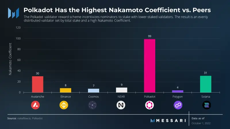 Messari, a leading provider of Web3 data, noted a particularly high Nakamoto Coefficient number for Polkadot. This is an indication of the number of nodes that must be compromised to affect the blockchain and prevent it from functioning correctly. A high Nakamoto measure indicates a network that is highly decentralized, and Polkadot’s score is impressive compared to other networks.